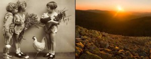 Už sama roční doba, na níž Velikonoce připadají, vyvolává ten pocit. Z polí, která obklopují mou rodnou obec, už sice sešel sníh, ležela však dosud černá a vlhká na slunci a ačkoli vzduch byl už vlahý a obloha modrá, stály stromy dosud s holými černými korunami bez listí. Louky se potichu zazelenaly a na potoce i při pramíncích lučních stružek se objevily temně zelené lemy listů s pupeny či dokonce už i květy blatouchů, jimž se tam u nás doma krásně říkávalo “velikonoční kvítí”.