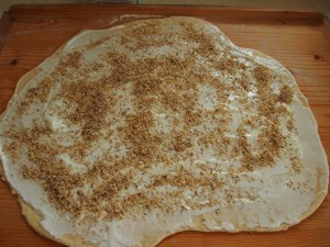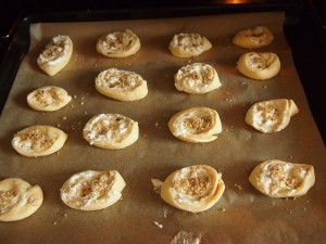 Těsto rozdělíme na 2 díly. Rozválíme, pomažeme tvarohem, posypeme ořechy a stočíme jako závin. Nakrájíme asi 1 cm silné proužky, které rukou zmáčkneme. Posypeme ještě ořechy. Pečeme při 190 st. asi 15 minut. Horké potřeme máslem a rumem, sypeme cukrem.