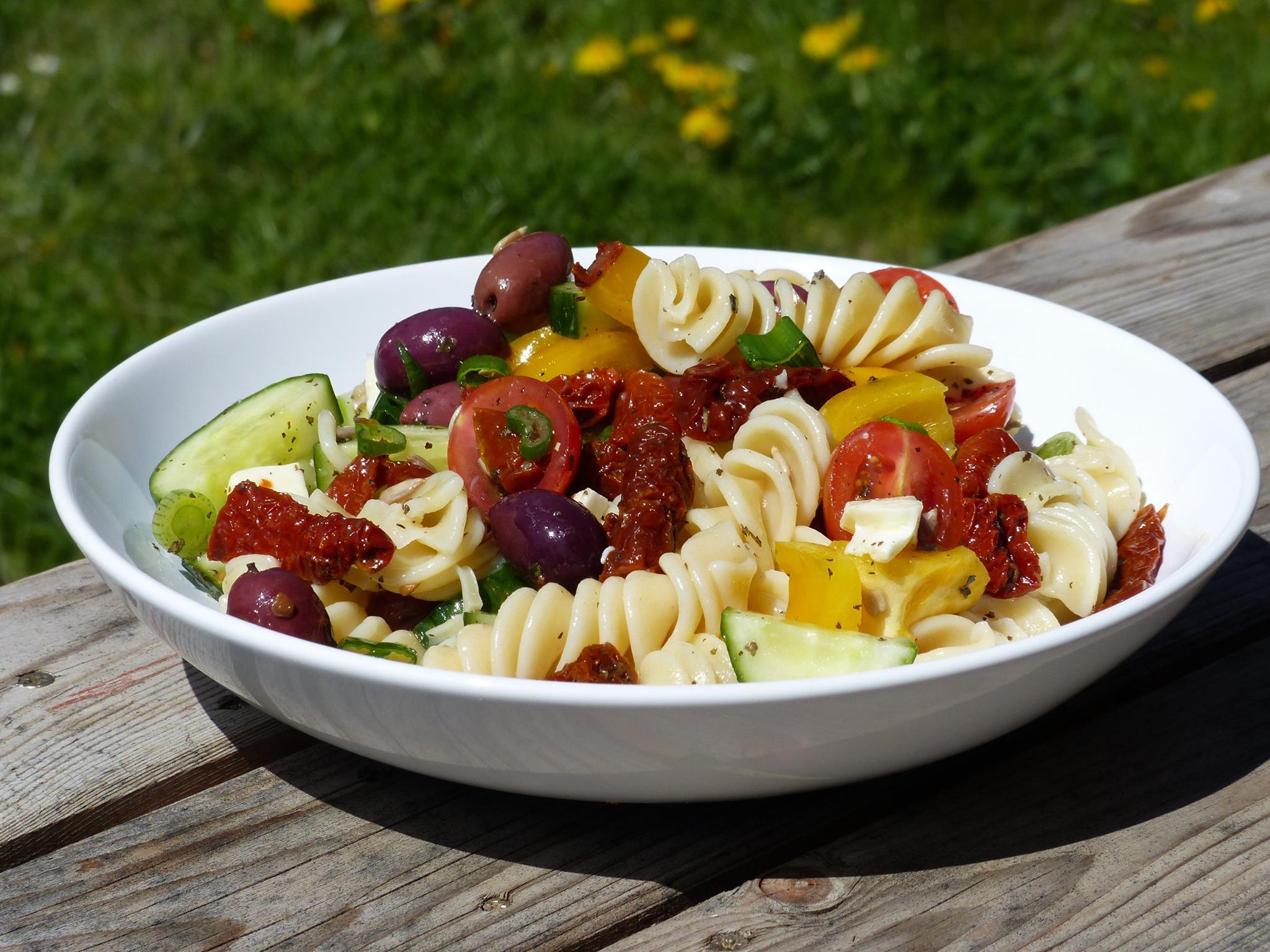 Jednoduché jídlo, kam si každý dá co má rád. Základem jsou kvalitní těstoviny a zelenina (okurka, rajčátka, kapie, jarní cibulka…..), dále olivy, sušená rajčata, sýr (mozarella, balkán, kozí sýr….), bylinky (bazalka, oregáno, tymián….cokoliv. A samozřejmě kvalitní virgin olivový olej. Někdo rád přidává jogurt, zakysanou smetanu…..tohle jídlo je skvěle variabilní a na teplé dny, které nás zase doufám brzo čekají, je to super. Udělá se ho mísa a pak se jen chodí do ledničky.