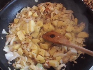 Na pánvičce rozpustíme sádlo a přidáme nakrájené zelí a na kostičky brambory. Osolíme, opeříme, okmínujeme a restujeme, dokud nejsou brambory měkké. Přidáme nasekané škvarečky a chvilku prohřejeme. Odstavíme,zamícháme smetanu,nasekané bylinky,vejce, dobře promícháme a dáme do pekáčku. Zapečeme při 200 st. asi 10 minut.