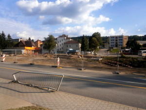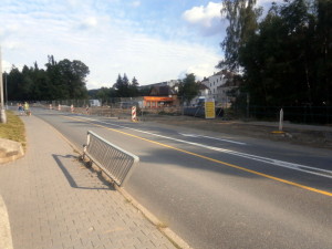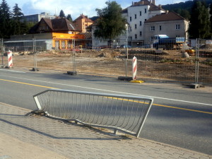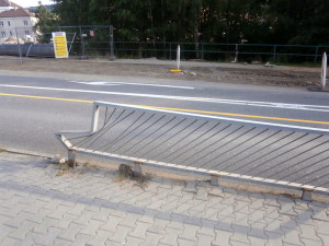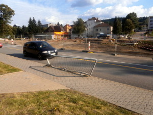 Sklářská ulice ve Vimperku je po dobu výstavby okružní křižovatky nuceně zúžena. ale zase ne natolik, aby se tam dvě auta vedle sebe nevešla. Jak kdy, nutno dodat. Zdeformované zábradlí u chodníku k Lidlu vypovídá, že některým řidičům už byla vozovka skutečně úzká. Naštěstí to skončilo bez střetu s lidmi.
