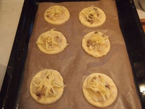 Rozválíme na plát asi 1cm (na prst) vysoký. Doporučuji válet po částech, těsto se potom trhá. Vykrajujeme koláčky, do středu vytlačíme důlek, do kterého dáme náplň. Okraje potřeme sádlem, dáme kopičku sýra (není nutné) a pečeme dozlatova.