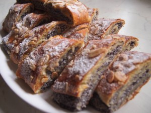 Vypracujeme hladké těsto, které necháme kynout. Potom rozdělíme na 2 díly, vyválíme, potřeme mazáním, stočíme a dáme na plech. Potřeme vejcem a sypeme mandlemi. Pečeme při 190 st. asi 15 minut. Po upečení potřeme máslem s rumem a posypeme moučkovým cukrem.