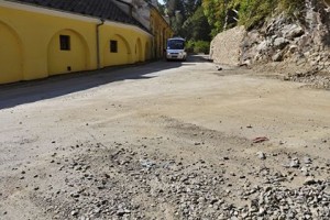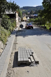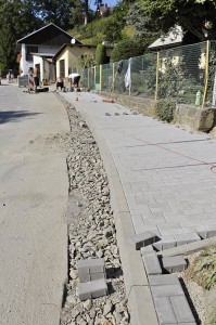 OBRAZEM: Stavba nového chodníku v Pivovarské ulici ve Vimperku. Dělníci začali pokládat zámkovou dlažbu