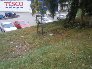 TOTO JE OSTUDA MĚSTA: Odpadky zaneřáděný prostor nad parkovištěm u marketu, pod slepou cestou