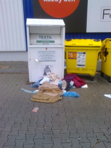 Takový hnus před supermarketem Tesco ve Vimperku. Co to asi je za lidi, kteří to dělají? Vandalové, zloději, feťáci, pitomci? Foceno ve středu 2. listopadu. Takto to na místě vypadalo ráno v osm hodin a večer před dvacátou hodinou.