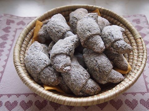 Rohlíčky se během pečení ,,nafouknou“. Horké potíráme máslem s rumem a sypeme moučkovým cukrem.